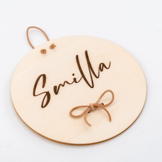 - Der Name wird auf dem Holzschild angebracht und ist 3mm tief, mit kleinem Regenbogen unter dem Namen