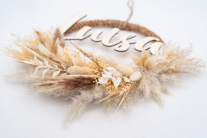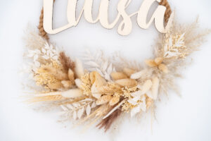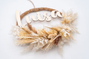Dieser Trockenblumenkranz ist ein tolles Dekoaccessoire im Boho Stil für dein Zuhause. Die Farbe der Trockenblumen ist in Beige- und Naturtönen gehalten. Der Kranz wird für dich handgefertigt und mit dem individuellen Namenszug personalisiert.