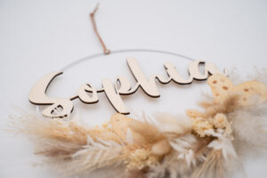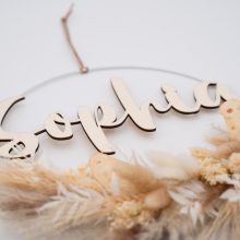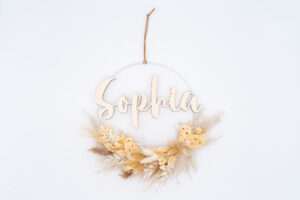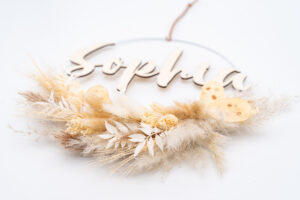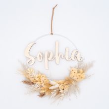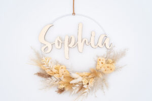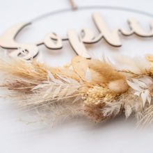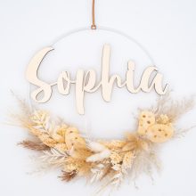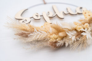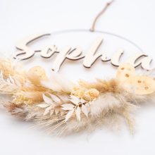 Dieser Trockenblumenkranz ist ein tolles Dekoaccessoire im Boho Stil für dein Zuhause. Die Farbe der Trockenblumen ist in Beige- und Naturtönen gehalten. Der Kranz wird für dich handgefertigt und mit dem individuellen Namenszug personalisiert.